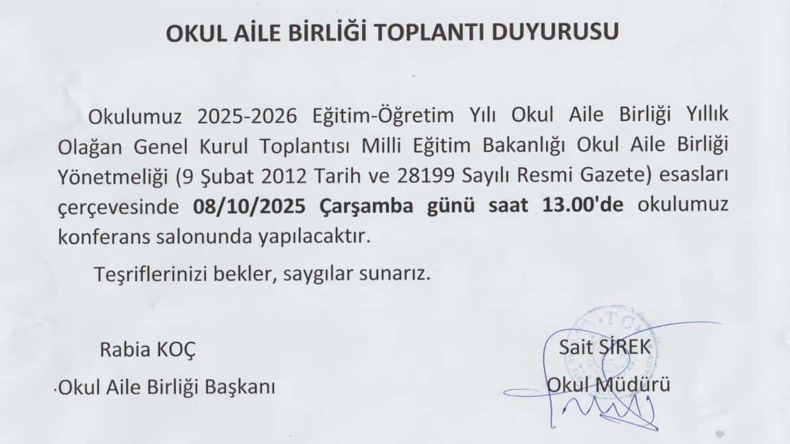 Okul Aile Birliği 2025/2026 Olağan Genel Kurul Toplantısı 08.10.2025 tarihinde saat:13.00 da Konferans Salonumuzda yapılacaktır. Tüm velilerimizin katılımını rica ederiz.
