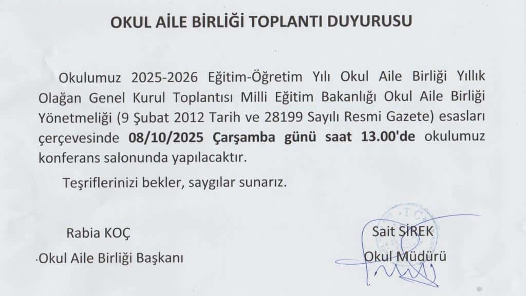 Okul Aile Birliği 2025/2026 Olağan Genel Kurul Toplantısı